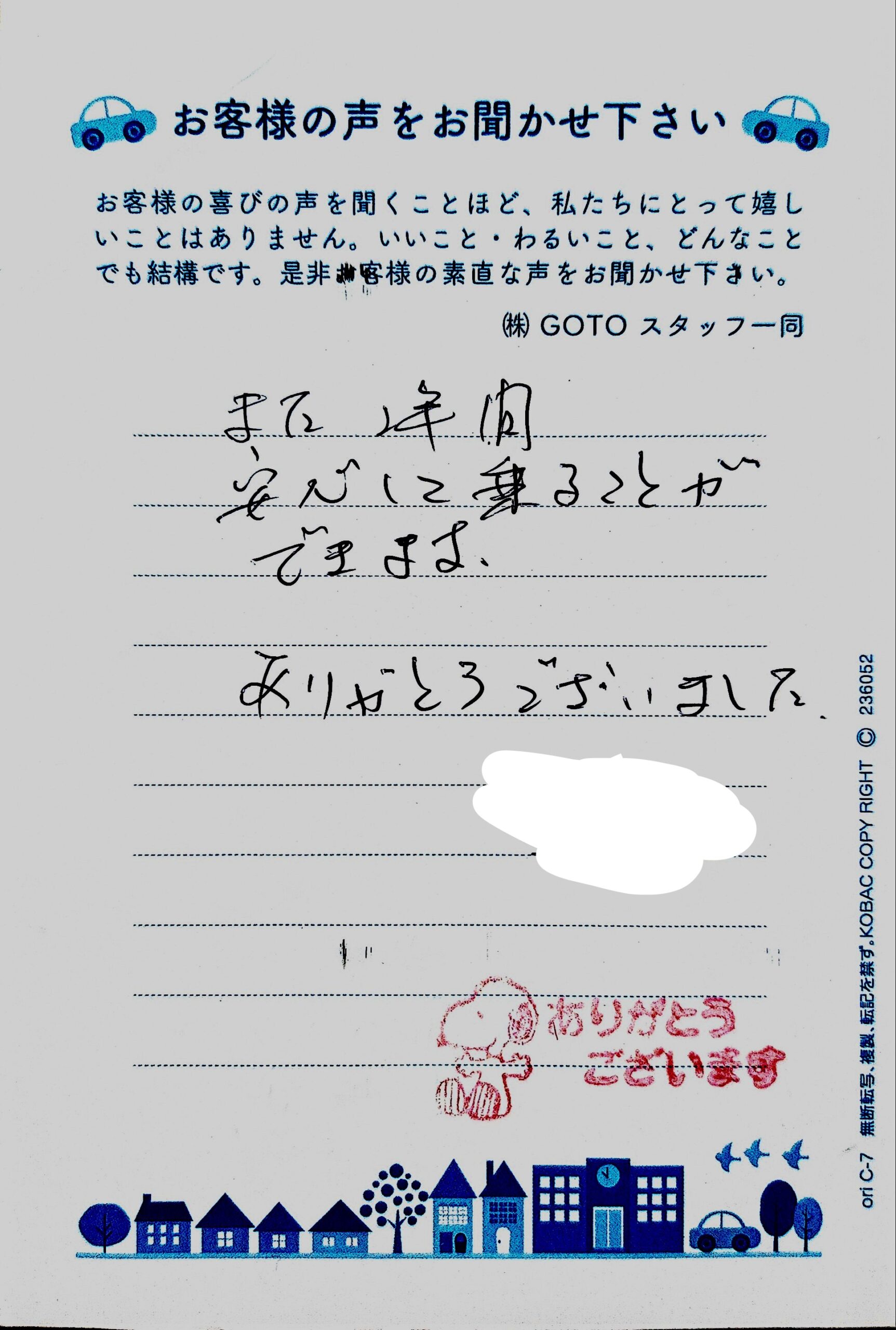 ご利用ありがとうございました。これからも安心・安全なカーライフをサポートして参ります。またのご来店をお待ちしております。