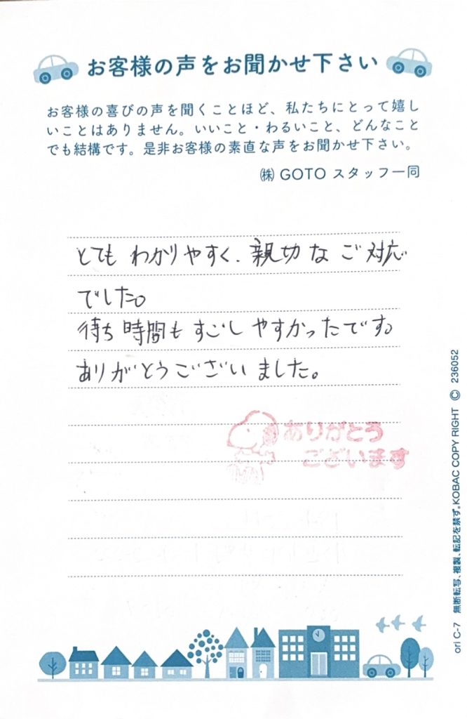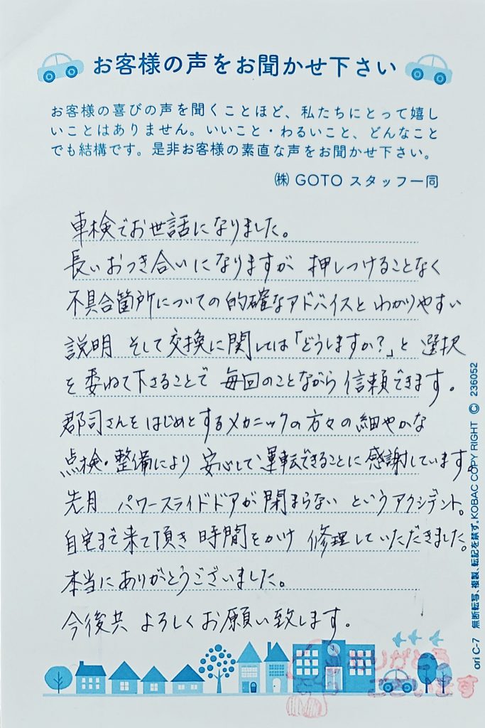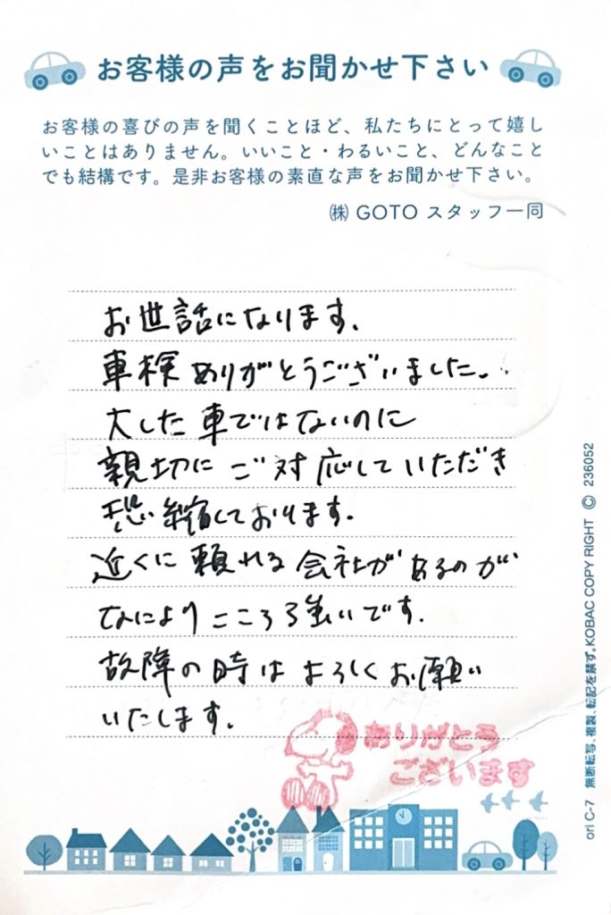 このたびは車検のご利用、そして心のこもったお言葉をいただき誠に有り難うございます。