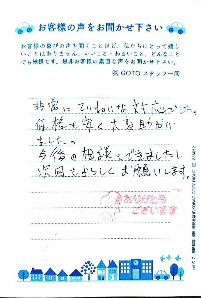 丁寧に整備して頂き自動車もとても調子がいいです。