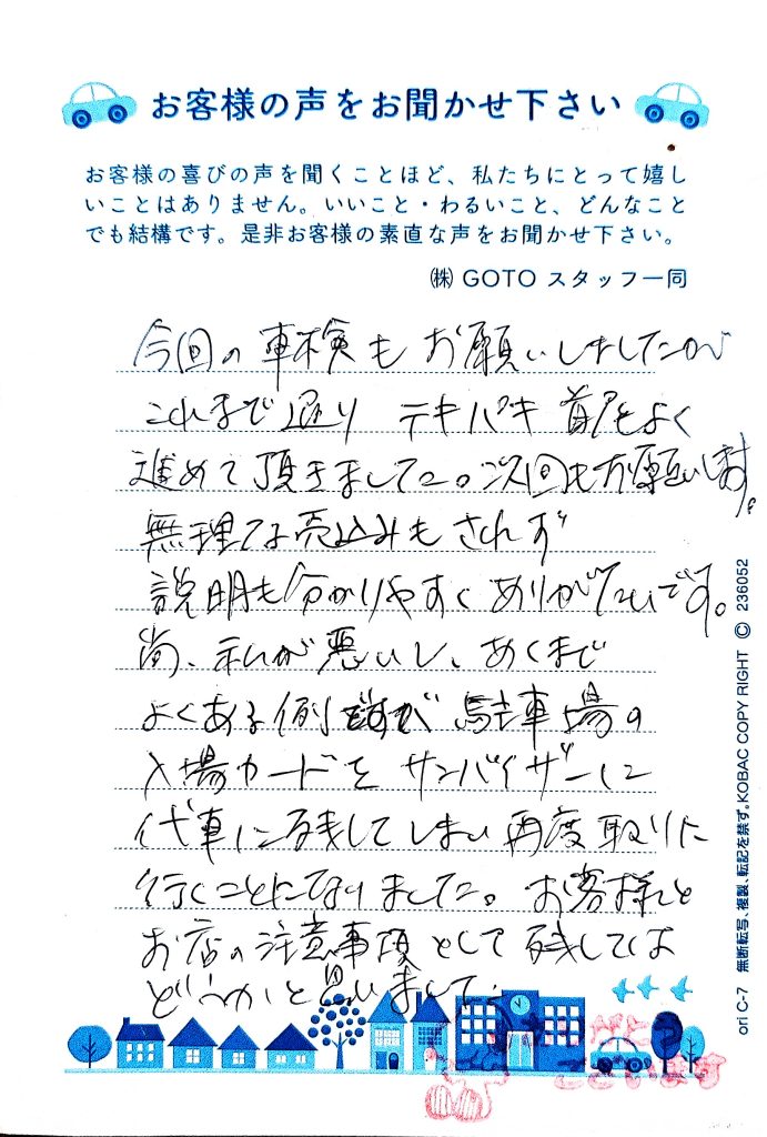 尚、私が悪いし、あくまでよくある例ですが、駐車場の入場カードとサンバイザーを代車に残してしまい、再度取りに行くことになりました。お客様とのお店の注意事項として残してはどうかと思いました。