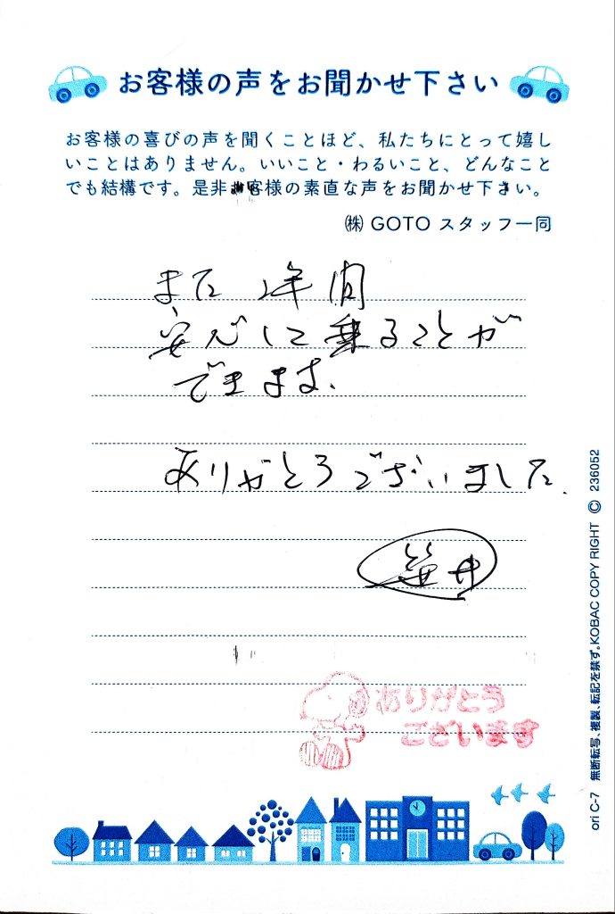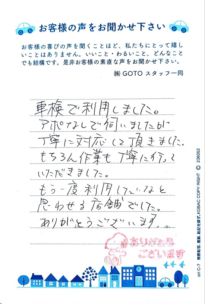このたびは車検のご利用、そして心のこもったお言葉をいただき誠に有り難うございます。