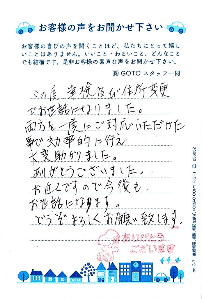 このたびは車検と住所変更のご依頼をいただき、誠にありがとうございました。