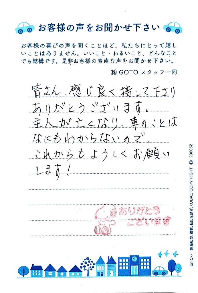 主人が亡くなり、車のことはなにもわからないのでこれからもよろしくお願いします!